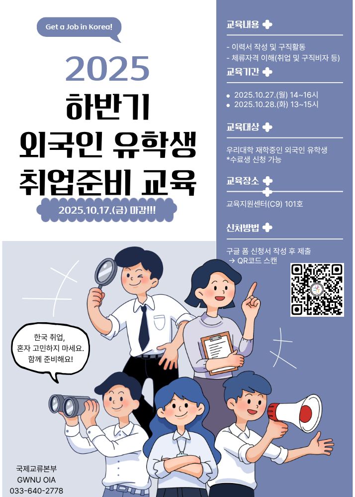 「2025년 하반기 외국인 유학생 취업 준비 교육」 진행하오니 관심 있는 학생들의 많은 참가 바랍니다.